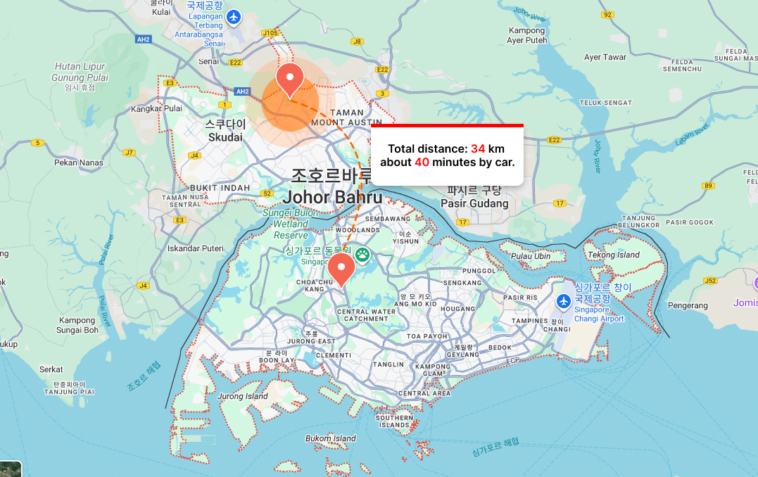 Johor Bahru, southern Malaysia, approximately 34 km (40 minutes by car) from central Singapore