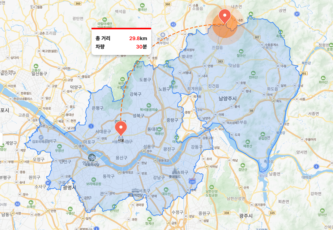 남양주시 진접읍. 서울 중심지에서 약 30km (차량 30)